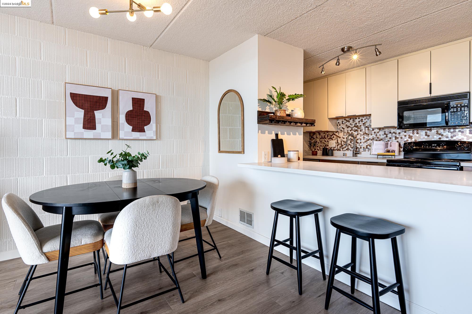 Views!! Welcome to this rare, dramatic, west facing offering at the coveted 1 Kelton Court. Nestled on a peaceful cul-de-sac, yet just moments from the vibrant energy of Piedmont Avenue and Oakland's most beloved amenities; enjoy boutique shops, great restaurants, cafes + much more. The building's Mid-century aesthetic is a perfect blend of classic elegance with modern convenience. Unit 9D is a highly desirable 1-bedroom/1 bath haven, with plenty of closet space, spacious bathroom and updated kitchen and new flooring throughout. This unit offers breathtaking city views and a coveted sense of privacy. Featuring floor-to-ceiling glass doors and windows that effortlessly connect the indoor and outdoor spaces. You'll love the tranquility of stepping outside onto your private patio while you soak up the gorgeous view. Included are a dedicated parking spot, additional storage space, bike parking. Spacious, updated laundry room in building. Open Saturday 2-4pm and Sunday 12-2pm